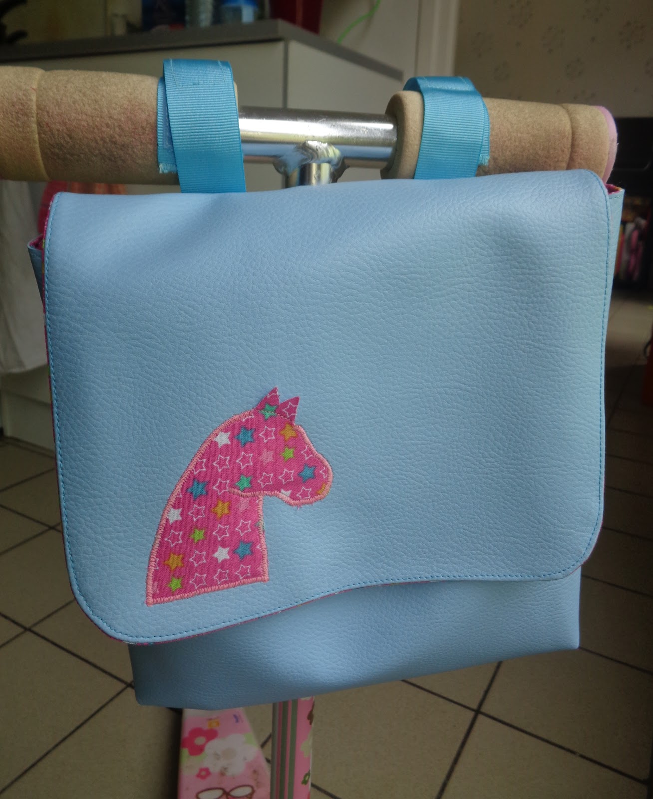 Avant qu'elle ne me sollicite pour des projets "équestres", je lui ai fait une sacoche à guidon pour son vélo ou sa trottinette.